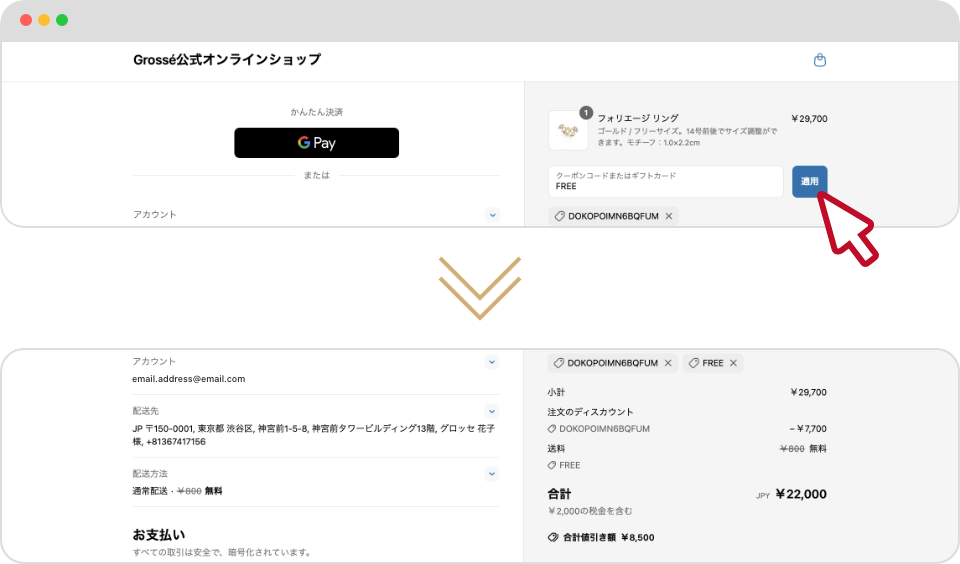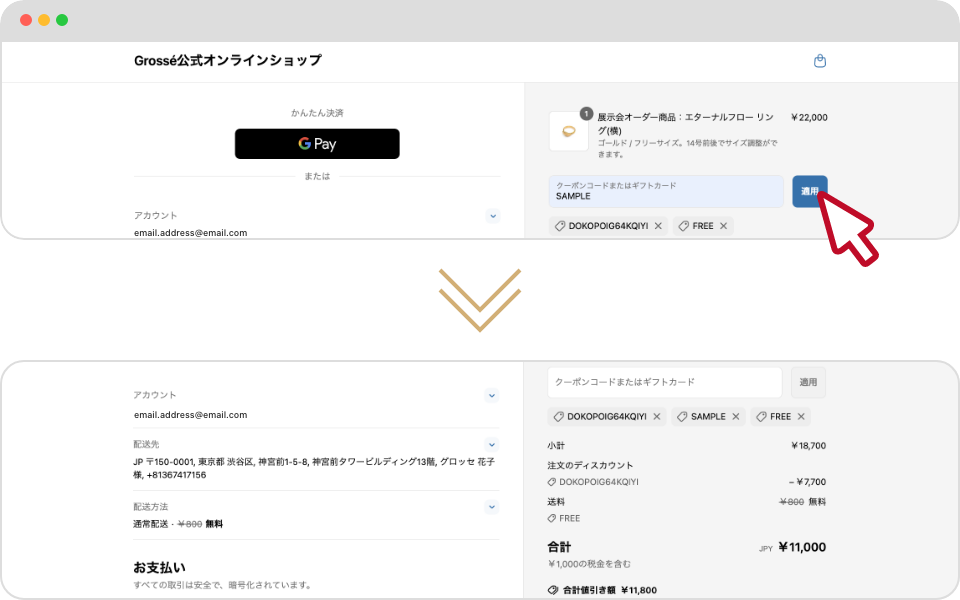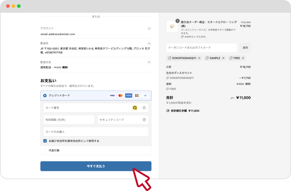 必要な情報を入力します。ご購入手続き画面の下部で、展示会専用クーポンコード(クーポンコード例:SAMPLE)と送料無料クーポン(クーポンコード:FREE)をご入力し「適用」を押してください。