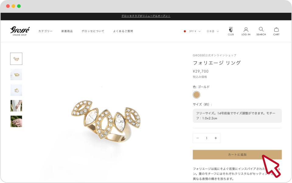 オンラインショップ上で商品を選び、「カートに追加」ボタンをタップします。