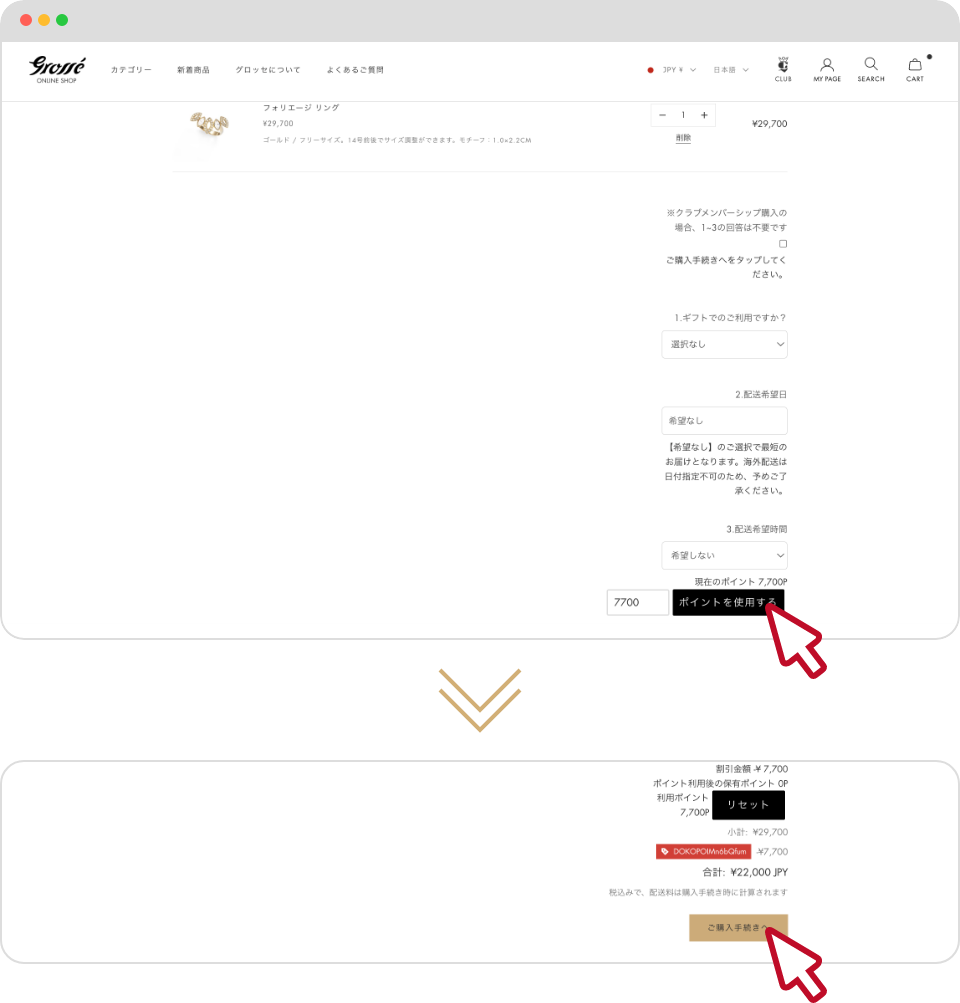 毎月、月会費7,700円=7,700ポイント(1円=1ポイント)として積み立てられ、グロッセオンラインショップ、パーティー会費や展示会オーダー商品などにご使用いただけます。