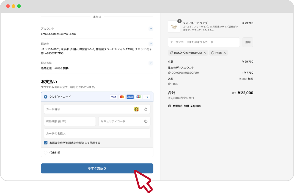 必要な情報を入力します。ご購入手続き画面の下部で、送料無料クーポン(クーポンコード:FREE)やその他割引クーポンをお持ちでしたらご入力し「適用」を押してください。